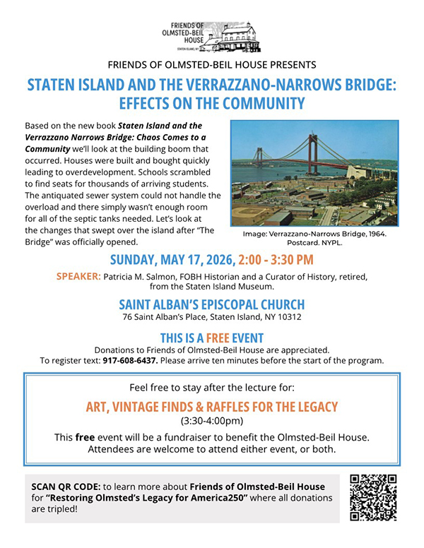 - St. Alban's Church, Friends of Olmsted-Beil house Presents – Staten Island and the Verrazzano-Narrows Bridge Effects on the Community, 2:00 – 3:00 PM