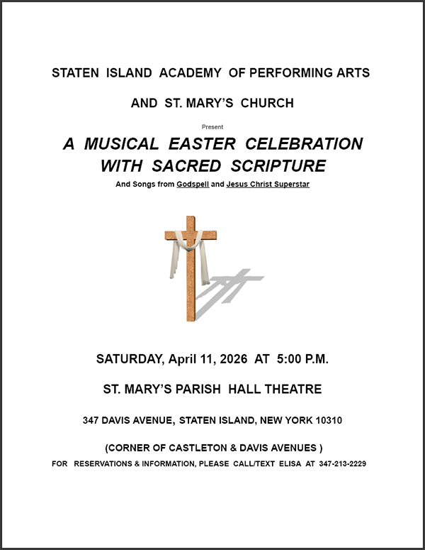 - St. Mary's, 5:00 PM - Musical Easter Celebration with Sacred Scripture including songs from Godspell and Jesus Christ Super Star.