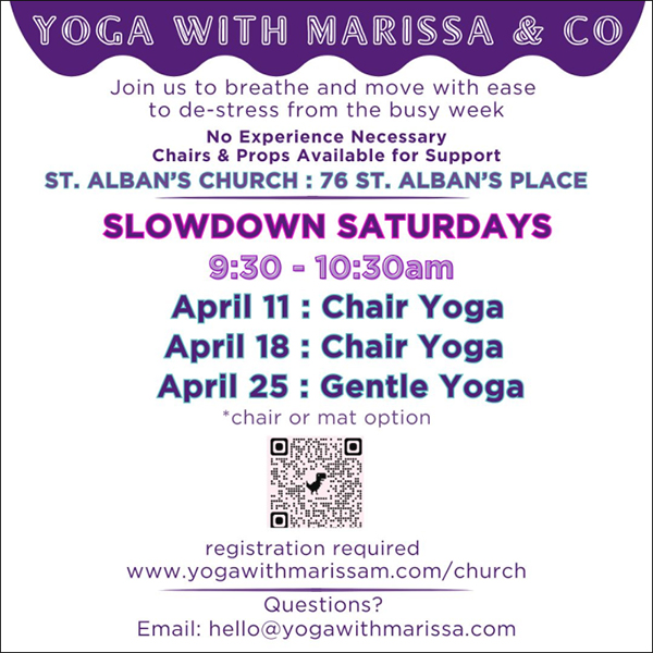 Yoga at St. Alban's, Saturday April 11, 18 and 25, 9:30 AM.