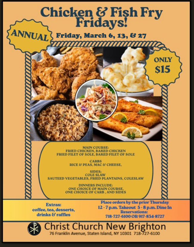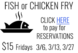 Fridays, March 6, 13, & 27. Choice of Fish or Chicken. See below for more details. CLick HERE to make reservations.