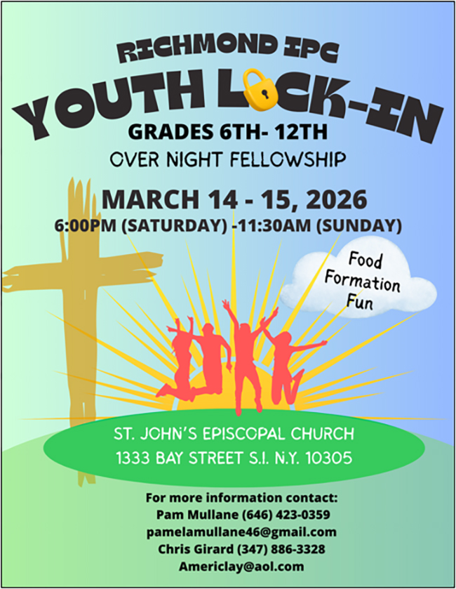 This year's Youth Lock-in, for those in grades 6 – 12, will be held at St. John's, 1333 Bay Street. The event begins on Saturday at 6:00 PM and ends after the 10:00 AM service at St. John's.